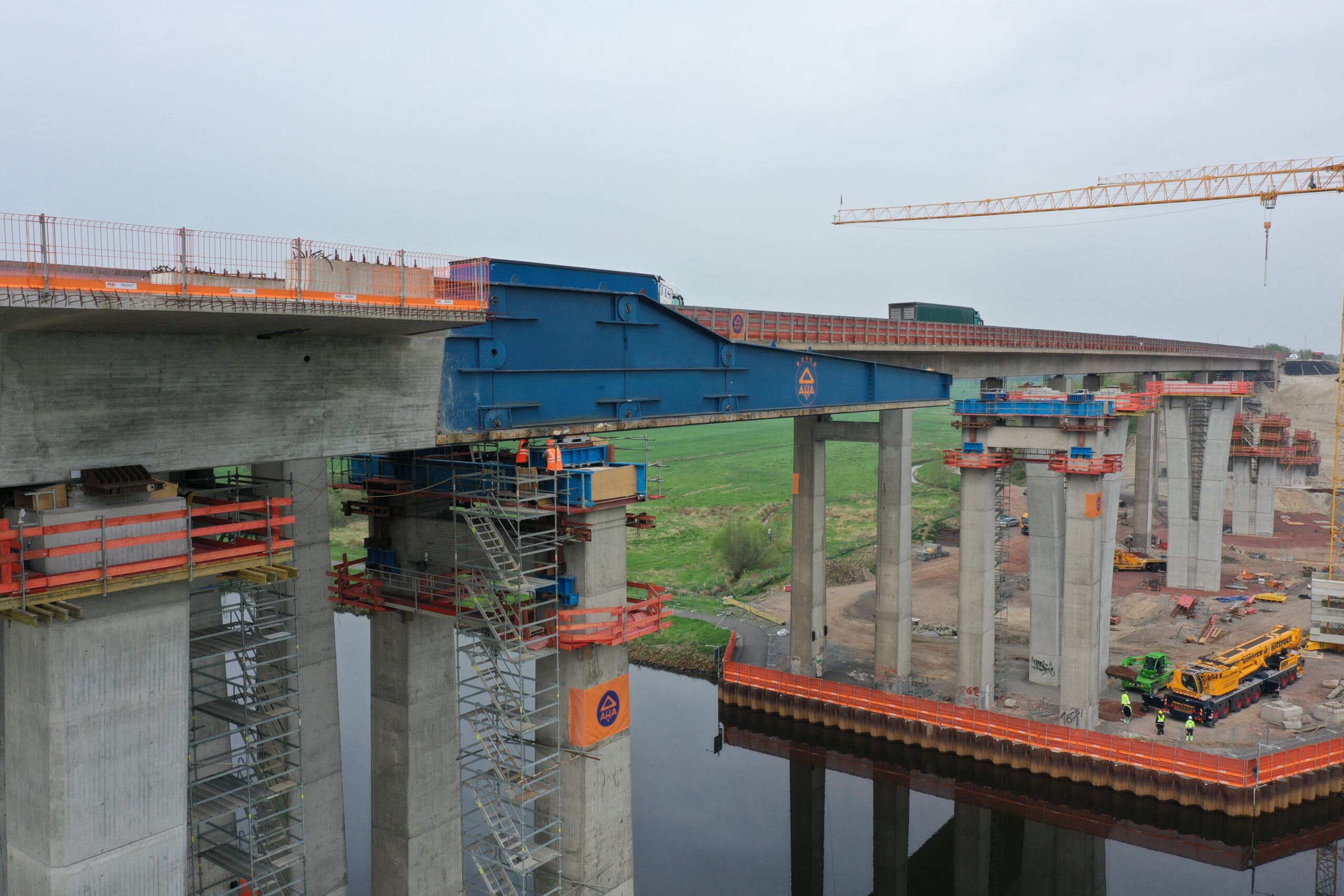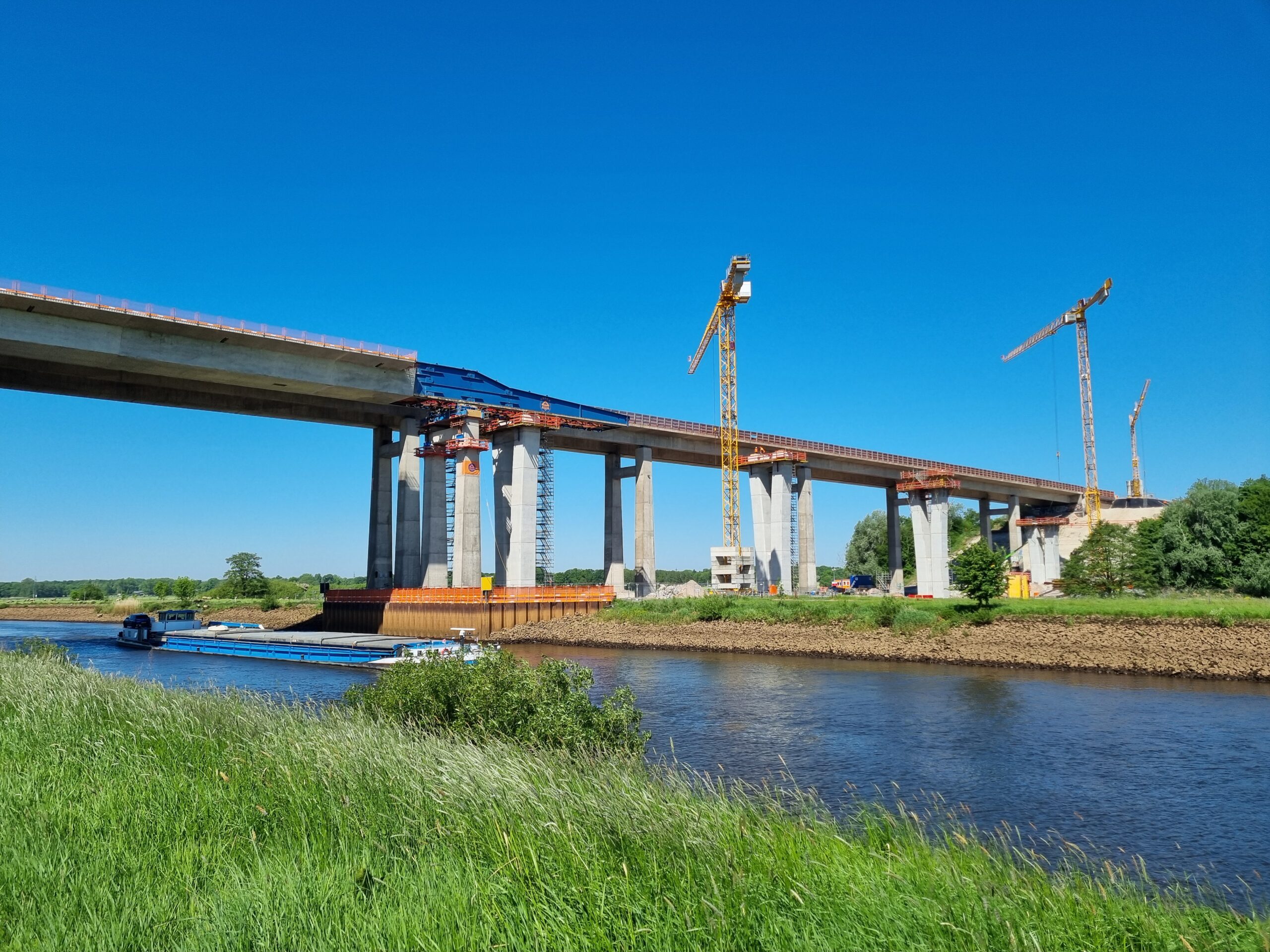 Für den Einschub über das im Endzustand eine Stützweite von 80,0 m aufweisende Huntefeld wurden die beiden flussnahen Bestandspfeiler als Hilfsstützen genutzt. Hierzu wurde diese pressengesteuert, um die Achslast auf maximal 10 MN zu begrenzen.