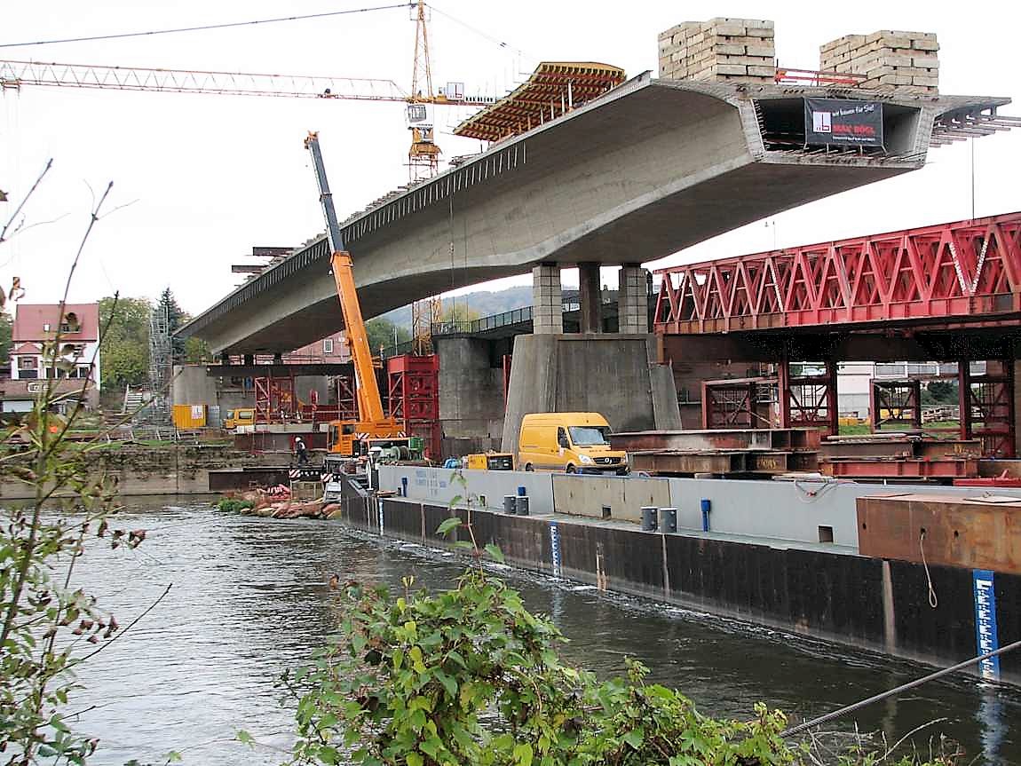- Herstellung in zwei Bauabschnitten auf einem frei über die Wasserstraße spannenden Traggerüst; Herstellung BA 1 in 2,30 m überhöhter Lage (wg. Lichtraumprofil Schiffahrt) und Absenken des 120 m langen Abschnitts