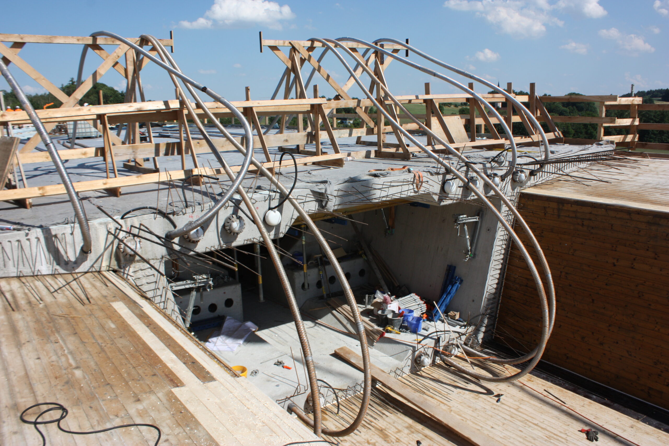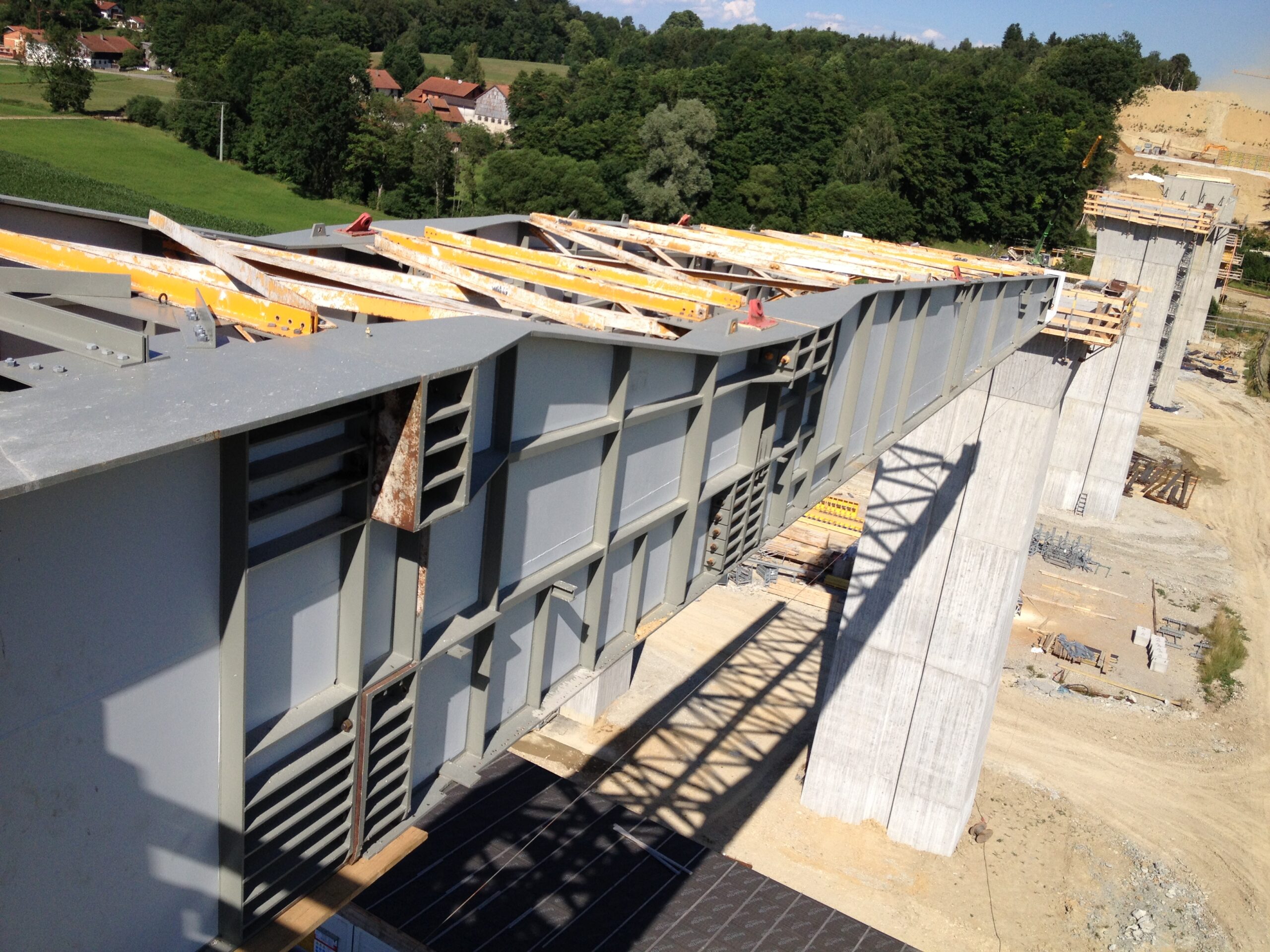 In Längsrichtung wird der Überbau in Mischbauweise durch intern in Fahrbahn- und Bodenplatte geführte Primärspannglieder und im Hohlkasten geführte externe Sekundärspannglieder vorgespannt.