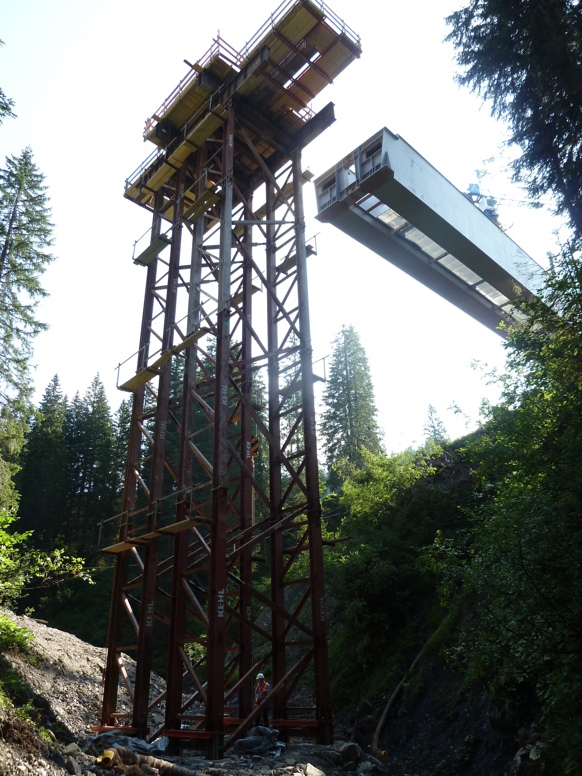 Der Brückenquerschnitt wird als zweistegiger Plattenbalken bestehend aus zwei dicht-geschweißten Stahlkästen und der im Verbund stehenden schlaff bewehrten Stahlbetonfahrbahnplatte ausgeführt. Die Konstruktionshöhe des Überbau beträgt an den Widerlagern ca. 4,25 m, wobei die kastenförmigen Stege mit einer leichten Voutung (Stich ~25 cm) an der Unterseite hergestellt werden. Die zwei Kastenstege werden untereinander an jedem zweiten Querschott gekoppelt. Der Stahlüberbau wurde im Taktschiebeverfahren über eine mittig angeordnete Hilfsstützen im Tobel hergestellt.