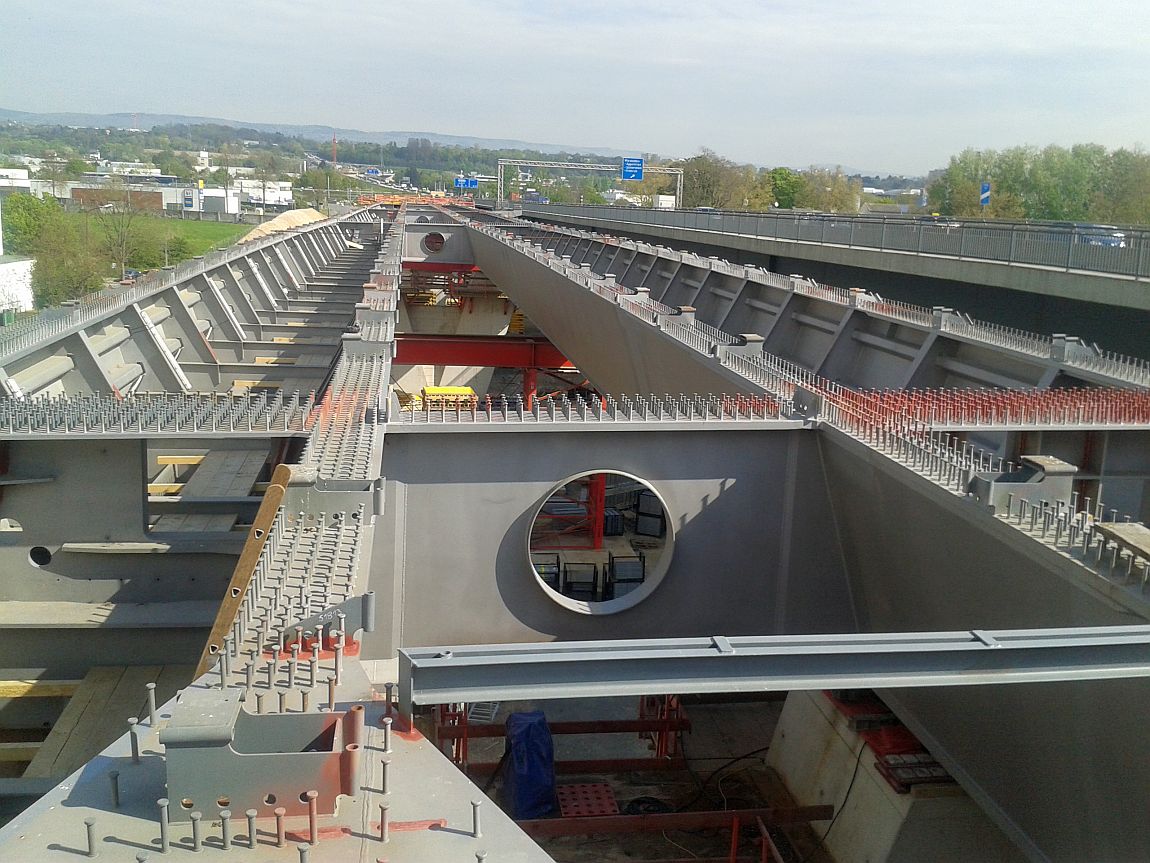 - Überbau teilweise als 1-zelliger Stahlhohlkasten (im Bereich der Hauptstützweiten), teilweise
