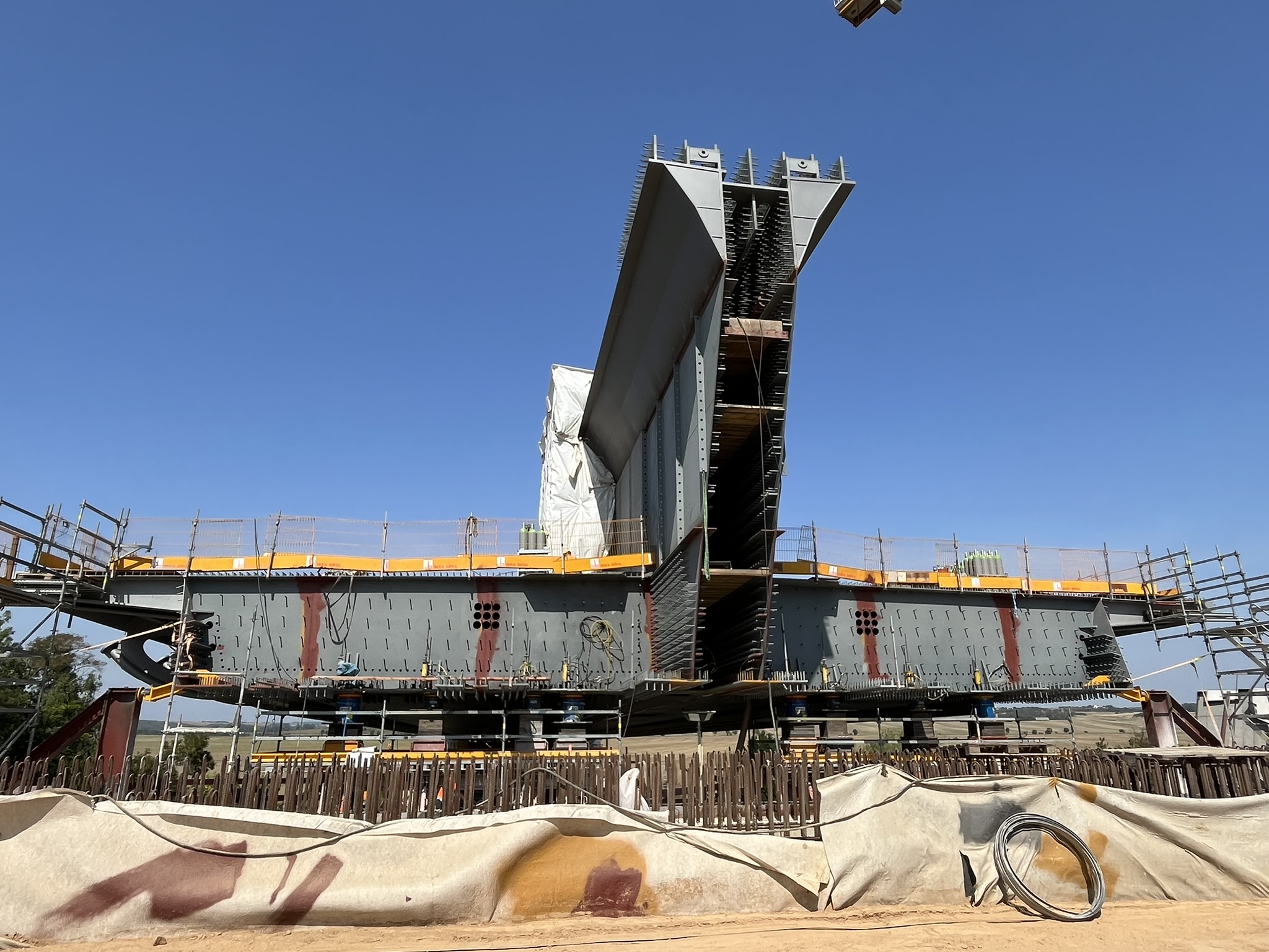 Während die Herstellung der Vorlandbrücke auf Traggerüst erfolgt, wird die Strombrücke mit Hilfsunterstützung auf einem Ponton eingeschoben.